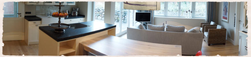 Der Essbereich Der offene Essbereich bietet am 2 meter langen Esstisch aus gekälkter Eiche Platz für bis zu 8 Personen. Die bequemen Charles Eames Stühle und die Sitzbank laden zum Verweilen ein. Genießen Sie den Ausblick auf die Terrasse und den Juister Dünenhafer. Für die Kleinsten stehen Kinderstühle bereit.