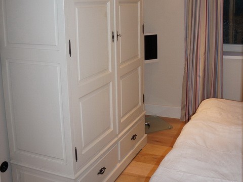 Die Schlafzimmer Die Apartment verfügt über zwei Schlafzimmer mit Doppelbetten, sowie ein Schlafzimmer mit Hochbett.  Die Großen Schränke bieten genügend Platz für Ihre Ferienausstattung.  Alle Betten sind mit hochwertigen Latexmatratzen ausgestattet. Die Allergiker-geeigneten Kopfkissen und Bettdecken sind bei Ihrer Ankunft bereits mit schöner Bettwäsche bezogen.   Das Südschlafzimmer ist zusätzlich mit einem Sat-TV ausgestattet.